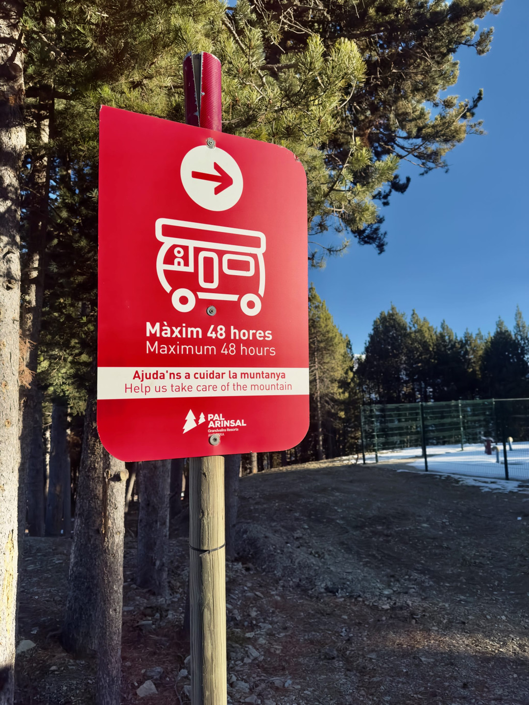 L'estació d'esqui de Pal ofereix un gran nombre de places d'aparcament per autocaravanes i campers a uns 200m de l'arribada del telecabina i dels primers remuntadors de la zona de La Caubella. L'estada màxima està limitada a 48h, però val la pena passar un cap de setmana en aquesta zona enmig de la natura i amb vistes espectaculars. L'àrea es troba a 1900m d'alçada, per tant és important portar equipaments d'hivern [fundes, cadenes o pneumàtics d'hivern obligatoris a Andorra entre l'1 de novembre i el 15 de maig]. També cal saber que les carreteres, a Andorra, es netegen molt ràpidament i és estrany que durant el matí no poguem trobar un bon moment per baixar amb seguretat la nostra autocaravana encara que estigui nevant.