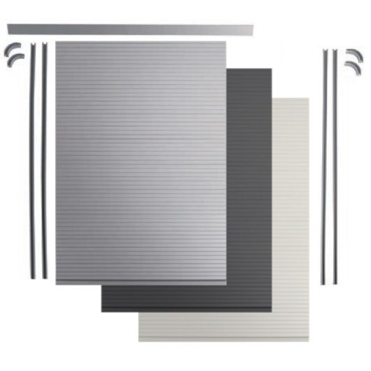 Rollladentür-Komplettset: Die Führungsschienen, die Rollladenmatte und die Einfahrblende können auf das gewünschte Türmaß und die Schranktiefe zugeschnitten werden. Material: Kunststoff.