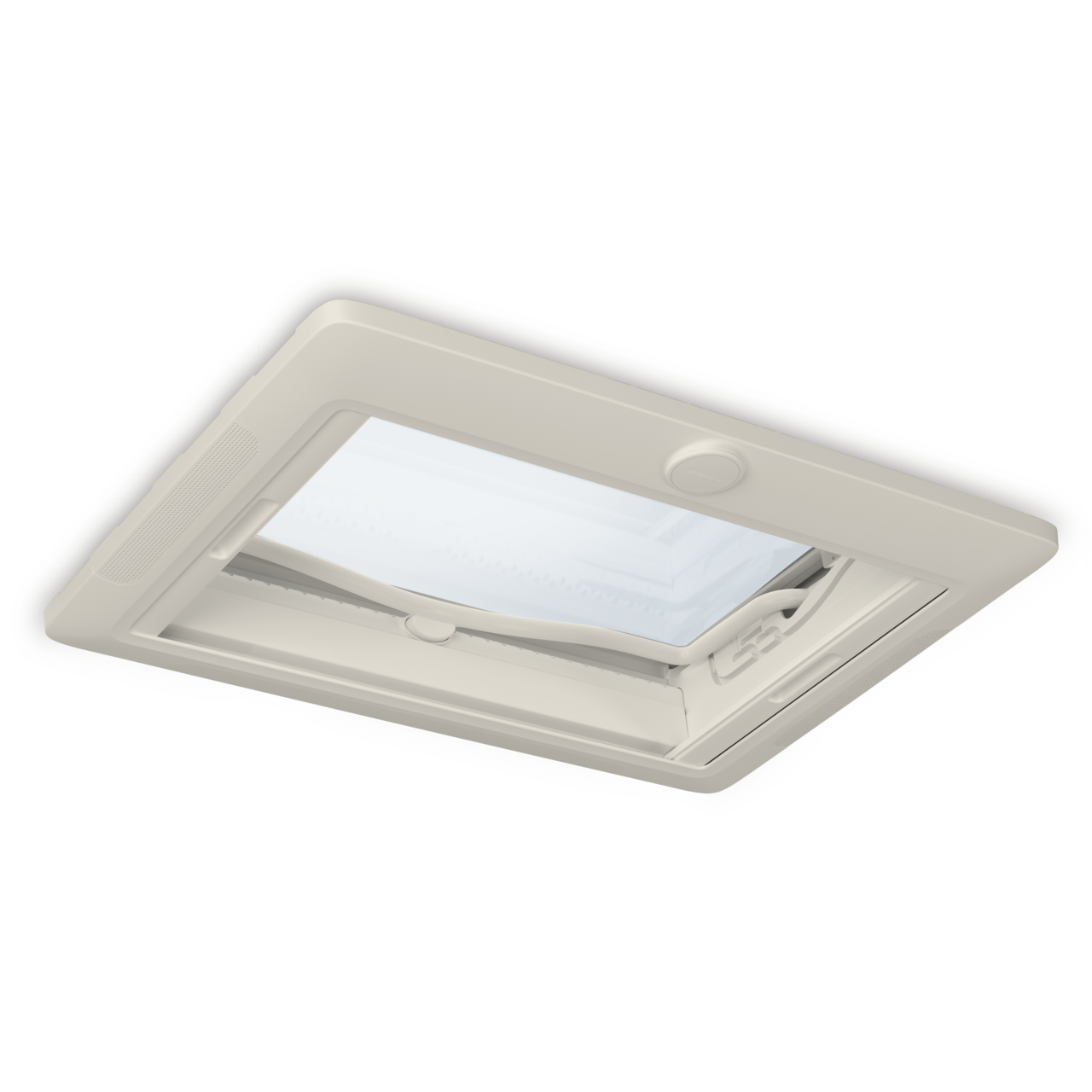 The Dometic Midi Heki roof window includes a dome with double acrylic glazing for insulation and a frame made from durable, weather-resistant ASA plastic.